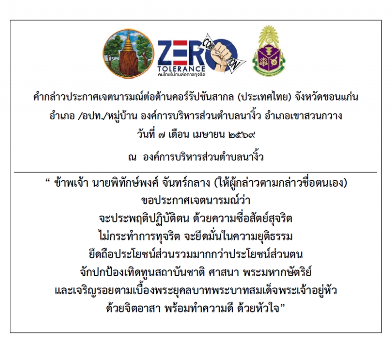 วันที่ 7 เมษายน 2569 นายพิทักษ์พงศ์ จันทร์กลาง นายกองค์การบริหารส่วนตำบลนางิ้วพร้อมด้วยคณะผู้บริหาร สมาชิกสภาองค์การบริหารส่วนตำบล ข้าราชการ พนักงานจ้างและลูกจ้าง ร่วมกันกล่าวคำประกาศเจตนารมณ์การต่อต้านทุจริต คอร์รัปชั่น เพื่อกระตุ้นจิตสำนึกให้บุคลากร ไม่ยอมรับและไม่ทนต่อการทุจริตทุกรูปแบบ สร้างภาพลักษณ์ที่ดีแก่องค์กร ณ ห้องประชุมองค์การบริหารส่วนตำบลนางิ้ว